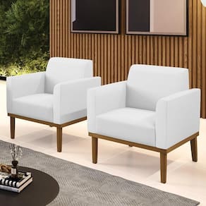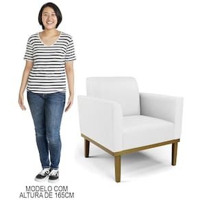 A Poltrona Decorativa é revestida em sintético, que é durável e fácil de limpar, e ainda valoriza o design da poltrona. Os braços e encosto são confortáveis em espuma D-18, já o assento é com espuma D-26 de alta densidade, que garante um assento firme e aconchegante, ideal para relaxar após um dia cansativo. A base em madeira de eucalipto é um charme à parte, que confere um toque Rústico e sofisticado à peça. São 2 poltronas com estrutura resistente que suporta até 120 kg cada. A montagem é muito simples, pois a poltrona já vem pronta, bastando apenas fixar a base com os parafusos que acompanham o produto. A limpeza também é muito prática, pois basta utilizar um pano limpo e levemente úmido, sem produtos abrasivos, para manter a sua poltrona sempre em bom estado. Sem dúvidas a Poltrona Para Sala vai transformar seu ambiente, deixando mais confortável e estiloso!