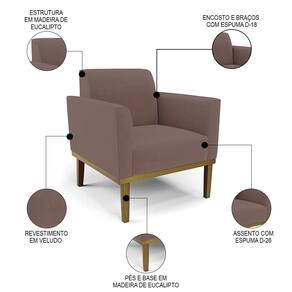 A Poltrona Decorativa é revestida em Veludo, que é durável e fácil de limpar, e ainda valoriza o design da poltrona. Os braços e encosto são confortáveis em espuma D-18, já o assento é com espuma D-26 de alta densidade, que garante um assento firme e aconchegante, ideal para relaxar após um dia cansativo. A base em madeira de eucalipto é um charme à parte, que confere um toque Rústico e sofisticado à peça. São 2 poltronas com estrutura resistente que suporta até 120 kg cada. A montagem é muito simples, pois a poltrona já vem pronta, bastando apenas fixar a base com os parafusos que acompanham o produto. A limpeza também é muito prática, pois basta utilizar um pano limpo e levemente úmido, sem produtos abrasivos, para manter a sua poltrona sempre em bom estado. Sem dúvidas a Poltrona Para Sala vai transformar seu ambiente, deixando mais confortável e estiloso!