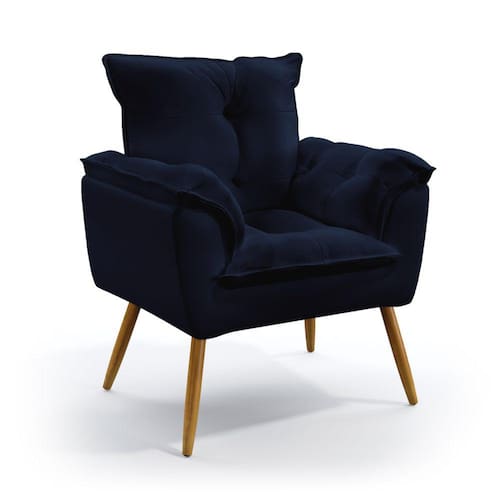 Características do Produto: Madeira de eucalipto proveniente de reflorestamento Fixação com grampos galvanizados Espuma Poliuretano D20 Enchimento com fibra siliconada e flocos Produto costurado Poltrona almofadada Revestimento: Veludo Cor: Azul Marinho Tamanho: Único Possui pés: Sim Tipos de pés: Pés palitos Possui 4 pés palitos de 25 cm Embalagem: plástico bolha, papelão ondulado, plástico Garantia de 3 meses contra defeitos de fábrica.