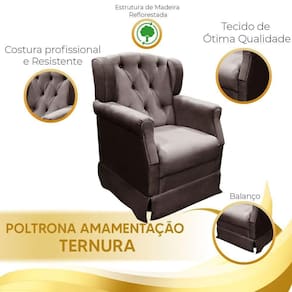 Poltrona Cadeira De Amamentação Balanço E Puff Ternura Suede Star Confort Café A poltrona amamentacao proporciona todo o conforto e aconchego que a familia precisa nesta fase tao especial, e encanta pelo seu estilo sofisticado. Feita com materia-prima de alta qualidade a poltrona possui estofado revestido por tecido de toque suave que proporciona aconchego para os momentos de amamentacao. O puff quadrado traz conforto e beleza para a rotina da mamae, e ajuda no descanso para pernas e pes tornando o momento ainda mais confortavel. A poltrona possui um balanco suave em sua base, e um encosto alto com espuma de excelente densidade e estrutura solida de madeira. A GARANTIA E DE FABRICA Comprando conosco, alem das vantagens em adquirir um produto de qualidade e sofisticacao, se eventualmente o mesmo apresentar algum problema, dentro do prazo de noventa dias, por sermos os fabricantes, te daremos total assistencia. Queremos lhe proporcionar uma experiencia agradavel com a compra e a certeza de estar negociando com uma empresa que preza acima de tudo, pela relacao de confianca com o cliente, nossa maior satisfacao.