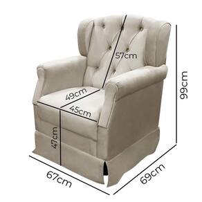 Dimensões da Poltrona: Altura: 99 cm; Largura: 67 cm; Profundidade: 69 cm; Peso: 23,200 Kg; Profundidade do Assento: 49 cm; Largura do Assento: 45 cm; Altura do Encosto: 57 cm; Altura do Assento: 47 cm.