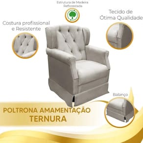 Poltrona Cadeira De Amamentação Balanço Ternura Suede Bege Star Confort Bege A poltrona amamentacao, proporciona todo o conforto e aconchego que a familia precisa nesta fase tao especial, e encanta pelo seu estilo sofisticado. Feita com materia-prima de alta qualidade a poltrona possui estofado revestido por tecido de toque suave que proporciona aconchego para os momentos de amamentacao. A poltrona possui um balanco suave em sua base, e um encosto alto com espuma de excelente densidade e estrutura solida de madeira. A GARANTIA E DE FABRICA Comprando conosco, alem das vantagens em adquirir um produto de qualidade e sofisticacao, se eventualmente o mesmo apresentar algum problema, dentro do prazo de noventa dias, por sermos os fabricantes, te daremos total assistencia. Queremos lhe proporcionar uma experiencia agradavel com a compra e a certeza de estar negociando com uma empresa que preza acima de tudo, pela relacao de confianca com o cliente, nossa maior satisfacao.