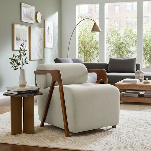 Tecido Bouclé Premium, Espuma D26 (assento), Espuma D20 (encosto rolo), Estrutura em madeira de eucalipto, Braços amadeirados.Vendido e entregue por CLIQUE & DECORE