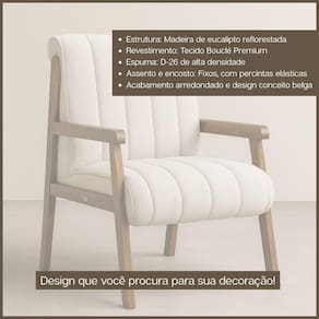 A Poltrona Conceito Belga Bouclé Premium alia elegância, conforto e durabilidade em um só produto. Com estrutura em madeira de eucalipto reflorestada e base maciça, é resistente e estável, ideal para uso diário em salas de estar, quartos ou recepções.