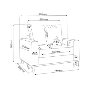 Características: Estrutura em MDP, 4 pés de madeira. Possui 1 mola bonel no assento, Espuma D23, Encosto fixo, almofada Solta 100 fibra siliconada, Revestimento tecido corino Suporta peso de até 110kg