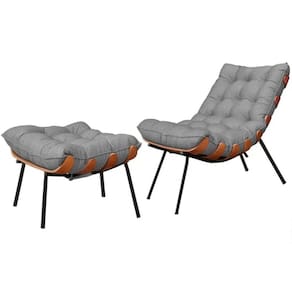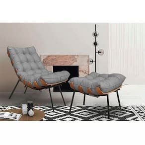 Poltrona Costela de Adão com Puff Tecido Linho Cinza