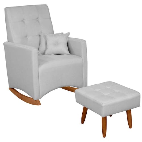A Poltrona de Amamentação Ana com Balanço Pés Canoa e Puff é perfeita para transformar os momentos com o bebê em instantes de conforto e aconchego. Com estrutura em madeira de eucalipto, revestimento em tecido e espuma D-23, oferece excelente sustentação com percintas elásticas. O design é valorizado pelo detalhe com botão capitonê no encosto e pelas duas almofadas que acompanham a peça. A base com pés tipo canoa em madeira maciça garante um balanço suave, enquanto o puff com pés retrô completa o visual e suporta até 120kg.