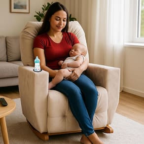 Feita com matéria-prima de alta qualidade a poltrona possui estofado revestido por tecido de toque suave que proporciona aconchego para os momentos de amamentação.