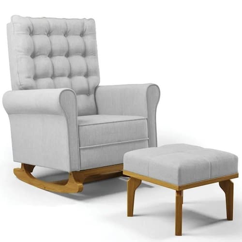O móvel ideal para você que procura conforto, qualidade e sofisticação. Confira a Poltrona de Amamentação Balanço e Puff Base de Madeira Brenda G05 Linho Cinza Claro, da Mpozenato!