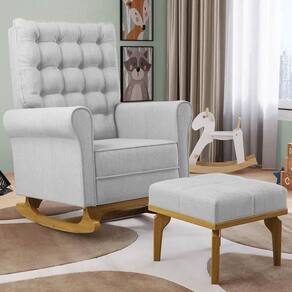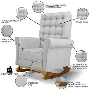 Uma Poltrona de Balanço feita com materiais de alta qualidade, estrutura em madeira de eucalipto, o tecido linho macio e resistente, e a espuma D23 a densidade ideal para o seu conforto, base em madeira com um lindo design e balanço suave, que ajuda a relaxar e a embalar o sono do seu bebê. O Kit Poltrona e Puff possui um design moderno e sofisticado, com detalhes em botonê revestido no encosto, que dão um toque de charme e elegância ao ambiente. A Poltrona de Amamentação também acompanha um puff pés madeira tecido linho, que serve como apoio para os pés ou como assento extra. O puff tem o mesmo acabamento da poltrona, criando um conjunto harmonioso e bonito.