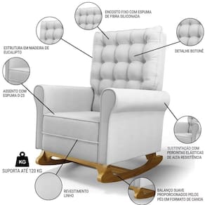 Uma Poltrona de Balanço feita com materiais de alta qualidade, estrutura em madeira de eucalipto, o tecido linho macio e resistente, e a espuma D23 a densidade ideal para o seu conforto, base em madeira com um lindo design e balanço suave, que ajuda a relaxar e a embalar o sono do seu bebê. O Kit Poltrona e Puff possui um design moderno e sofisticado, com detalhes em botonê revestido no encosto, que dão um toque de charme e elegância ao ambiente. A Poltrona de Amamentação também acompanha um puff pés madeira tecido linho, que serve como apoio para os pés ou como assento extra. O puff tem o mesmo acabamento da poltrona, criando um conjunto harmonioso e bonito.