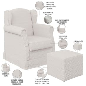 Características: Estrutura em madeira de reflorestamento de eucalipto, pinus e MDF. Revestimento em Bouclê na cor Cru de alta qualidade. Assento com espuma D-23. Encosto com espuma D-20. Braço com espuma D-20 com tratamento anti-mofo. Percinta elástica de Nylon. Peso suportado: Até 100 kg. Sistema de balanço em madeira com molas, fixado com parafusos.