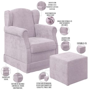 Características: Estrutura em madeira de reflorestamento de eucalipto, pinus e MDF. Revestimento em Bouclê na cor Rosê de alta qualidade. Assento com espuma D-23. Encosto com espuma D-20. Braço com espuma D-20 com tratamento anti-mofo. Percinta elástica de Nylon. Peso suportado: Até 100 kg. Sistema de balanço em madeira com molas, fixado com parafusos.