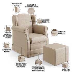 Características: Estrutura em madeira de reflorestamento de eucalipto, pinus e MDF; Revestimento em Facto Pérola Metalizado de alta qualidade; Assento com espuma D-23; Encosto com espuma D-20; Braço com espuma D-20 com tratamento anti-mofo; Percinta elástica de Nylon; Peso suportado: Até 100 kg; Sistema de balanço em madeira com molas, fixado com parafusos;