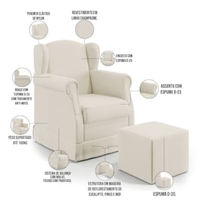 Características: Estrutura em madeira de reflorestamento de eucalipto, pinus e MDF; Revestimento Linho Champagne de alta qualidade; Assento com espuma D-23; Encosto com espuma D-20; Braço com espuma D-20 com tratamento anti-mofo; Percinta elástica de Nylon; Peso suportado: Até 100 kg; Sistema de balanço em madeira com molas, fixado com parafusos;