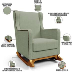 Projetada para oferecer conforto e praticidade em um dos mais momentos mais ublimes da maternidade, a Poltrona de Amamentação com Balanço Mavie, da Lyam Decor, é a esccolha perfeita já que combina um design moderno com uma experiênica inigualável de bem-estar. Isso graças aos materiais de qualidade que compõem a sua estrutura, como a madeira de eucalipto tratada e os pés balanço estilo canoa, que proporciona estabilidade e segurança. Além disso, o assento é tapeçado com espuma D-26 e o encosto e braças D-23, garantem uma amamentação tranquila e aconchegante, tanto para mãe quanto para o bebê.