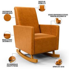Características: Estrutura em madeira de reflorestamento de eucalipto. Revestimento em Couríssimo na cor Whisky de alta qualidade. Assento com espuma D-26 e percintas elásticas. Encosto e braços com espuma D-23. Peso suportado: Até 120 kg. Base de balanço em madeira estilo canoa.