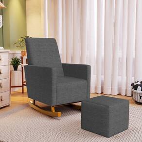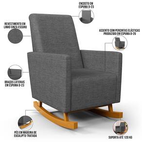 Características: Estrutura em madeira de reflorestamento de eucalipto. Revestimento em Linho na cor Cinza Escuro de alta qualidade. Assento com espuma D-26 e percintas elásticas. Encosto e braços com espuma D-23. Peso suportado: Até 120 kg. Base de balanço em madeira estilo canoa.