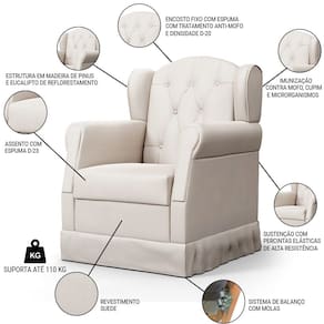 Características do Produto: Material da Estrutura: Madeira Eucalipto/Pinus de Reflorestamento. Material da Espuma: Poliuretano. Tipo de Espuma: D-20 e D-23. Peso Suportado: 110 kg. Revestimento: Suede. Tipo de Encosto: Fixo. Tipo de Assento: Fixo. Tipo de Base: Com Balanço. Quantidade de Lugares: 1 Lugar.