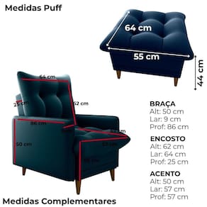 Conjunto Poltrona com Puff Montreal combina conforto e funcionalidade, composto por duas peças ideais para momentos de descanso ou amamentação. A poltrona conta com sistema reclinável de dois estágios (modo leitura e descanso), estrutura em madeira de Eucalipto de reflorestamento, reforçado com precintas elásticas. O assento e encosto são preenchidos com uma combinação de fibra siliconada e flocos de espuma (assim como o Puff), enquanto as braças são em espuma D23, o revestimento em tecido Veludo Light (toque mais leve e aveludado, brilho elegante e visual clássico). Os pés também em madeira completam, suportando até 110 kg por assento. Este móvel chegará em sua casa separado em 01 volume.