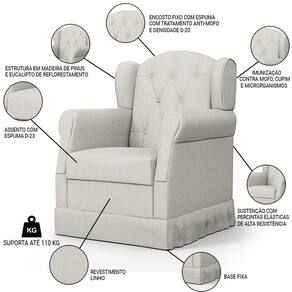 A Poltrona de Amamentação Fixa Lucy P04 Linho Off White - Mpozenato é a escolha perfeita para as mamães que buscam conforto e praticidade durante a amamentação. Fabricada com madeira de eucalipto de reflorestamento, ela é resistente e durável, além de ser ecologicamente correta. A poltrona conta com percintas elásticas, que oferecem maior conforto e durabilidade, e sua estrutura de madeira é imunizada contra mofo, cupim e microrganismos, garantindo que ela dure por muito tempo. Com um design moderno e elegante, a Poltrona de Amamentação Fixa Lucy é a escolha perfeita para qualquer ambiente, seja no quarto do bebê, na sala de estar ou em qualquer outro cômodo. Invista em conforto e qualidade para você e seu bebê com a Poltrona de Amamentação Fixa Lucy. Compre já!