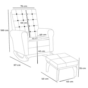 Poltrona de Amamentação e Descanso Base Madeira Com BalançoConforto, qualidade e sofisticação em uma Poltrona de Balanço. Estrutura em madeira de eucalipto, tecido resistente, percintas elásticas no assento e encosto, e espuma D23 e fibra para conforto. Base em madeira com design elegante e balanço suave, ideal para relaxar e embalar o sono do bebê. Design moderno com detalhes em botonê revestido no encosto, agregando charme e elegância ao ambiente. ESPECIFICAÇÕES Dimensões do Produto:Largura: 75 cm.Altura: 100 cm.Profundidade da Poltrona: 87 cm.Peso: 30 kg. Outras Medidas:Largura Interna do Assento: 50 cm.Altura do Chão até o Assento: 45 cm.Altura do Encosto: 66 cm.Profundidade Interna do Assento: 50 cm. Características do Produto:Material da Estrutura: Madeira Eucalipto.Tipo de Espuma: D-23 e D-18.Peso Suportado: 120 kg.Revestimento: CourinoTipo de Encosto: Fixo.Tipo de Assento: Fixo.Tipo de Base: Canoa Balanço.Material da Base: Madeira.Quantidade de Lugares: 1 Lugar. Montagem: O produto é enviado montado, sendo necessário somente parafusar a base.sendo de responsabilidade do cliente acoplar ou contratar um profissional de sua confiança Diferenciais:- Sustentação do assento e encosto com percintas elásticas.- Base de madeira canoa balanço.- Detalhe em botonê. Conteúdo da Embalagem: 1 Poltrona Volumes: 1 Volumes. Recomendação de Limpeza: Utilize pano levemente úmido. Observações importantes:- Produto para uso residencial em ambiente interno, não devendo ficar exposto diretamente ao sol, calor e umidades excessivas.- Pode haver alguma diferença de tonalidade entre a imagem e o produto, por conta do tratamento de imagens e a calibração de cores do monitor.- As imagens são meramente ilustrativas, não acompanham objetos de decoração e eletrônicos.- Confira o estado da embalagem, não devendo assinar o comprovante em caso de danos.- Confira as dimensões do produto e certifique-se de que passará normalmente por supostos elevadores, portas, escadas e/ou corredores de sua residência.- A transportadora não é responsável por subir escadas e elevadores. Marca: Não Informado