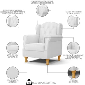 Conteúdo da Embalagem: 1 Poltrona, 4 Pés de Madeira, 1 Puff.