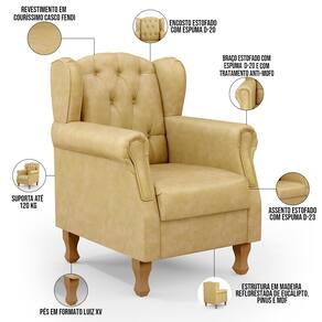 Características Poltrona: Estrutura em madeira de reflorestamento de eucalipto, pinus e MDF. Revestimento em Couríssimo na cor Fend de alta qualidade. Assento com espuma D-23. Encosto com espuma D-20. Braço com espuma D-20 com tratamento anti-mofo. Percinta elástica de Nylon. Peso suportado: Até 100 kg. Pés em formato Luis XV.