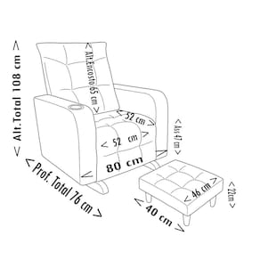 Medidas da Poltrona Comprimento total: 80 cm Profundidade total: 76 cm Altura total: 106 cm Altura do assento: 47 cm Altura do encosto: 65 cm Comprimento do assento: 52 cm