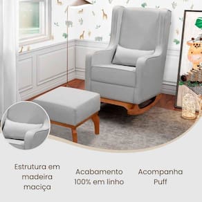 Além de ser perfeita para o quarto do bebê, também pode compor salas de estar, cantos de leitura ou espaços de descanso, trazendo charme e bem-estar ao ambiente. O encosto alto, assento profundo e puff de apoio promovem postura correta e alívio das tensões durante a amamentação.