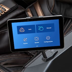 Painel de Controle com Tela Touchscreen: Painel de controle completo com todas as funções da poltrona ao alcance de suas mãos e tela touchscreen que utiliza imagens para exibir de forma fácil e intuitiva, todas as funções disponíveis, as funções ativadas e as partes do corpo que estão sendo massageadas.