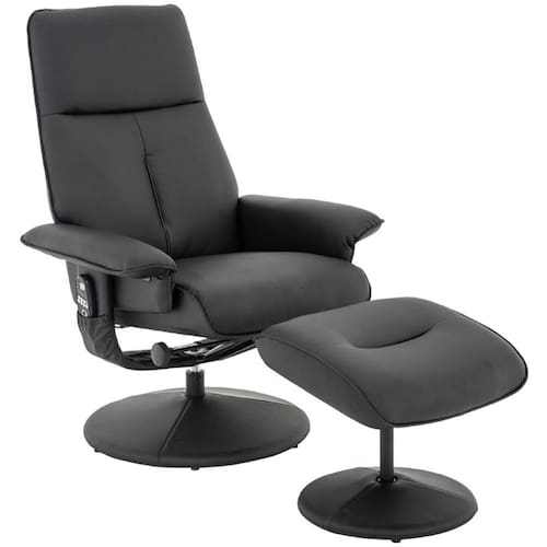 Características: Estrutura em madeira compensada, base em aço com revestimento em PU. Revestimento em PU de alta qualidade na tonalidade Preto. Encosto reclinável e assento giratório. Possui 6 pontos de massagem com modos independentes e função aquecimento. Produto bivolt com controle. Acompanha apoio para pés. Tempo de funcionamento recomendado é de 30 minutos. Suporta até 120 kg.