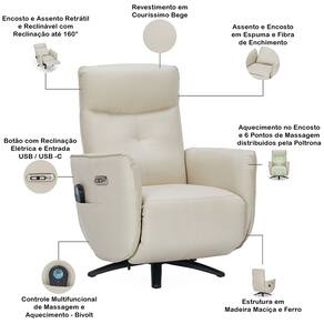 Criada para quem exige sofisticação e bem-estar, seu design contemporâneo integra-se perfeitamente a ambientes modernos, enquanto sua tecnologia avançada conquista até os mais refinados apreciadores do conforto. Com 6 pontos de massagem que envolvem seu corpo e aquecimento no encosto, cada momento será uma jornada de relaxamento profundo. Além disso, é uma poltrona giratória manual, pensada para se aproveitar diferentes ângulos do ambiente. Já o ajuste da reclinação elétrica é feito com controle remoto, ao passo que até seus dispositivos pessoais terão espaço graças ao conector USB integrado. Para completar, o bolso lateral oferece praticidade para manter tudo ao alcance das mãos, enquanto você desfruta da experiência.