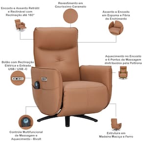 Criada para quem exige sofisticação e bem-estar, seu design contemporâneo integra-se perfeitamente a ambientes modernos, enquanto sua tecnologia avançada conquista até os mais refinados apreciadores do conforto. Com 6 pontos de massagem que envolvem seu corpo e aquecimento no encosto, cada momento será uma jornada de relaxamento profundo. Além disso, é uma poltrona giratória manual, pensada para se aproveitar diferentes ângulos do ambiente. Já o ajuste da reclinação elétrica é feito com controle remoto, ao passo que até seus dispositivos pessoais terão espaço graças ao conector USB integrado. Para completar, o bolso lateral oferece praticidade para manter tudo ao alcance das mãos, enquanto você desfruta da experiência.