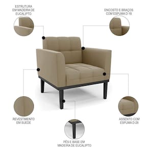 Esta Poltrona Decorativa é revestida em Suede, que é durável e fácil de limpar, e ainda valoriza o design da poltrona. Os braços e encosto são confortáveis em espuma D-18, já o assento é com espuma D-26 de alta densidade, que garante um assento firme e aconchegante, ideal para relaxar após um dia cansativo. A base em madeira de eucalipto é um charme à parte, que confere um toque Rústico e sofisticado à peça. A poltrona tem uma estrutura resistente e suporta até 120 kg. A montagem é muito simples, pois a Poltrona já vem pronta, bastando apenas fixar a base com os parafusos que acompanham o produto. A limpeza também é muito prática, pois basta utilizar um pano limpo e levemente úmido, sem produtos abrasivos, para manter a sua poltrona sempre em bom estado. Sem dúvidas um item que vai transformar a sua sala em um ambiente mais confortável e estiloso!