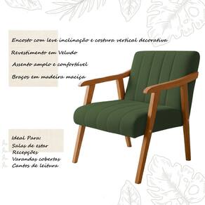 Características Tipo: Poltrona Modelo: Lívia Tecido: Veludo Cor: Verde Braço em madeira maciça Assento e encosto amplos e confortáveis Indicada para uso em ambientes internos