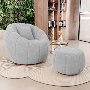 Conjunto Poltrona Decorativa Concha Giratória com Puff Estilo Abóbora Shell: a união ideal entre design autoral e funcionalidade para transformar seus ambientes com elegância e personalidade. Inspirado nas formas orgânicas da natureza, o conjunto combina curvas suaves e proporções harmônicas, proporcionando charme e bem-estar em um só lugar.