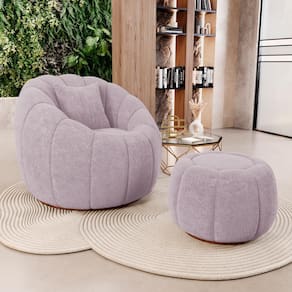 Conjunto Poltrona Decorativa Concha Giratória com Puff Estilo Abóbora Shell: a união ideal entre design autoral e funcionalidade para transformar seus ambientes com elegância e personalidade. Inspirado nas formas orgânicas da natureza, o conjunto combina curvas suaves e proporções harmônicas, proporcionando charme e bem-estar em um só lugar.