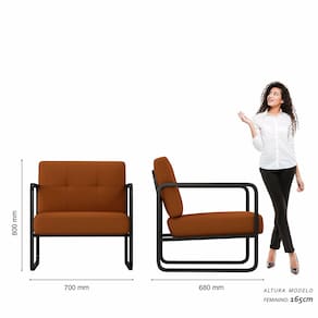 Detalhes Técnicos da Poltrona - Assento e Encosto Tapeçados, Estofados e Fixos - Espuma do Assento e do Encosto: D20 - Tonalidade Estrutura: Preto Fosco - Tonalidade Estofado: Suede Terracota - Material: Metalon - Medida Poltrona: A:80CM x L:70CM x P:68CM - Poltrona suporta até 120KG