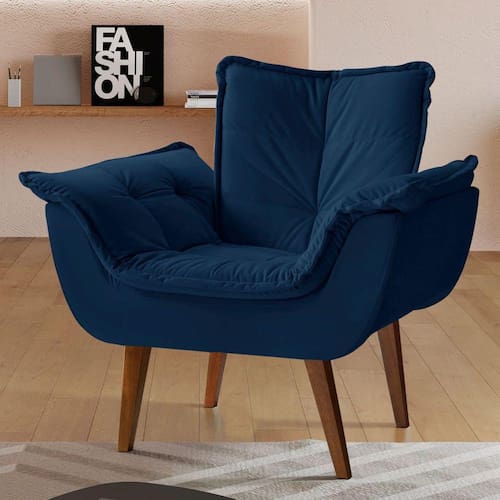 Os pés são de madeira maciça e o sistema de montagem dos pés com cantoneira de fixação em aço e parafusos brocantes que proporcionam firmeza e consistência. Acompanha Almofadas extras: Não Acompanha Puff: Não Almofada do assento: Fixa Almofada do encosto: Fixa Altura do assento até o chão: 45 cm Altura do Encosto: 46 cm Altura dos Pés: cm Ambiente Principal: Sala de Estar Complexidade da Montagem: Baixa: pode ser montado por uma pessoa sozinha Cor: Veludo Azul Marinho Cor do Produto: Veludo Azul Marinho Design Assinado: Não Enchimento do Assento: Espuma D-28 Enchimento do Braço: Espuma D-28 Enchimento do Encosto: Espuma D-28 Encosto para a Cabeça: Não Estampado: Não Extensível: Não Firmeza do Assento: Médio Itens Inclusos: 1 Poltrona, Kit Pés e Manual de Montagem Manual de Montagem e Instalação: https://product-hub-prd.madeiramadeira.com.br/698879/documents/eba74a91-99da-4876-a629-65ce9be9e87d845019poltronaerosmontagem.pdf Material do Braço: Madeira maciça, MDF, espuma, pet fon e tecido Material dos Pés: Madeira Maciça Modelo de Poltrona: Fixo Necessita Montagem: Sim Origem do Produto: Nacional Peso: 15,5 kg Possui Percintas Elásticas: Sim Possui Pés: 04 Possui Rodízio: Não Recomendações de Uso, Manutenção e Limpeza: A limpeza do revestimento deve ser feita com escova ou tecido de algodão branco levemente umedecidos em água morna, sabão neutro ou produto específico. Não usar produtos corrosivos nem a base de solventes, como: cloro, alvejantes, detergentes, entre outros;Não expor o estofado à luz direta. Mantenha portas e janelas sempre protegidas com cortinas e blackout. A exposição contínua à radiação da luz, danifica o revestimento, apodrecendo os fios, trincando a superfície e desbotando as cores;Não lavar o revestimento das almofadas pois pode desfiá-las, abrindo as costuras;Não utilizar o estofado para fins diferentes do que foi projetado: ficar em pé, pular, arrastar, sentar nos braços, peso na caixa traseira, entre outros tipos de ações que poderão danificar o produto. Sistema de Montagem: pés e parafusos Suporta Até (kg): 120 kg Tecido Predominante: Veludo Tipo de Assento: Fixo Tipo de Encosto: Fixo Tipo de Espuma do Assento: Soft Tipo de Espuma do Encosto: Soft Tipo de Poltrona: Decorativa Ean: 7908506261884