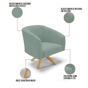 A Poltrona Decorativa Stella é a combinação perfeita de conforto, elegância e modernidade. Seu design curvo e marcante oferece uma sensação única de aconchego, como um abraço acolhedor, tornando-se a peça ideal para compor sua decoração com estilo e sofisticação. Revestida em veludo cotelê na cor Menta, a poltrona Stella apresenta um encosto com acabamento texturizado e volumoso externo que lembra um plissado, adicionando um toque elegante e alinhado às tendências atuais. Seja na sala de estar, quarto ou escritório, ela se adapta com facilidade. Sua estrutura robusta é sustentada por uma base giratória de madeira MA30, unindo resistência e design contemporâneo. A tendência desse estilo minimalista ganha destaque, conferindo sofisticação ao móvel, que é perfeito para qualquer espaço que exija funcionalidade e bom gosto. Com enchimento em espuma D-23 no encosto e assento, a Poltrona Decorativa Stella garante o máximo de conforto, mesmo em longos períodos de uso. Além desse modelo, também temos várias opções em base/pés e uma grande variedade de tecido/cores para atender ao seu estilo e conforto. E para deixar seu ambiente ainda mais harmonioso, oferecemos também kits especiais no mesmo design. Caso queira ajuda para escolher a melhor opção para o seu espaço, estamos à disposição! OBSERVAÇÃO IMPORTANTE: A é realizada no informado, não realizamos o para andares superiores, como subir escadas, elevadores ou guinchos. Não realizamos montagens, desmontagens ou instalações. Todos esses serviços são de responsabilidade do comprador. Dimensões do Produto: Altura Total: 81 cm Largura Total: 69 cm Profundidade Total: 60 cm Altura do Encosto: 40 cm Largura do Assento: 45 cm Profundidade do Assento: 45 cm Altura do chão ao Assento: 45 cm Espessura do Assento: 15 cm Espessura do braço: 7 cm Altura do chão ao braço: 70 cm Altura interna do braço: 28 cm Tamanho dos pés: 30 cm Peso: 20 kg Especificações do Produto: Estrutura: Madeira Eucalipto Espuma: D-23 Tecido: Veludo Cotelê, com acabamento texturizado externo Peso Suportado: Até 120 Kg Tipo de Pés: Base Giratória MA30 Tipo de Encosto: Fixo Complexidade da Montagem: Baixo Montagem: O produto vai montado, apenas parafusar a base : 90 dias contra de fabricação Instruções de Limpeza: Utilizar um pano limpo e levemente úmido Você irá Receber: 01 Poltrona - Entregue em: 01 Volume