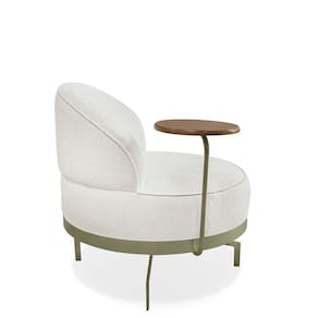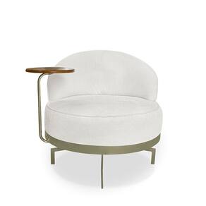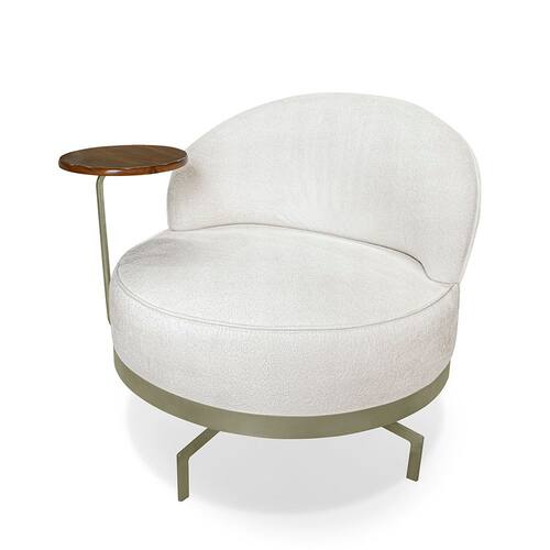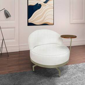 A base giratória em aço carbono, une resistência e modernidade, enquanto o detalhe em madeira maciça valoriza o acabamento artesanal e exclusivo. Além disso possui uma mesinha acoplada que se destaca por sua versatilidade e transforma a experiência de uso. Ela funciona como apoio para livros, xícaras, controles ou até um notebook.