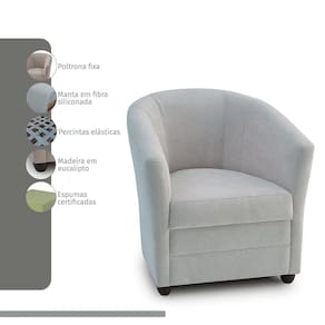 Assentos com espuma flexível de poliuretano densidade 29kg/m macia, certificada, fabricação própria, sustentados por percinta elástica. Encosto densidade 18kg/m. Estrutura de madeira maciça de eucalipto 100% reflorestada. Fixação da estrutura: grampos galvanizados anti-ferrugem. Apoiados no chão com pés de pvc de 6 cm. Revestimento/tecido: Boucle 100% poliéster, com toque macio.