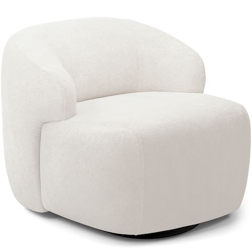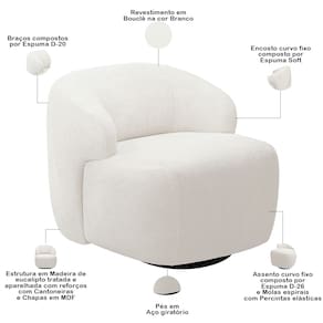Características: Estrutura em madeira de eucalipto tratada e aparelhada com reforços, cantoneiras e chapas em MDF. Revestimento em Bouclê de alta qualidade na cor Branco. Encosto curvo fixo composto por espuma soft. Assento curvo fixo composto por espuma D-26 e molas espirais. Percintas elásticas no assento para maior resistência e durabilidade. Braços compostos por espuma D-20. Pés em aço giratório. Peso suportado: Até 120 kg.