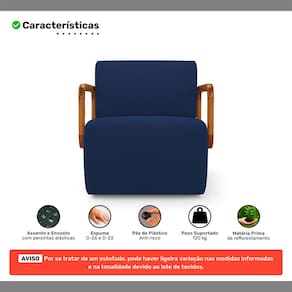 O encosto fixo é tapeçado com espuma D-23 e percintas elásticas, enquanto o assento oferece espuma D-26, manta acrílica e percintas para um apoio macio e ergonômico. Revestida em Veludo, proporciona toque agradável e visual sofisticado. Os pés plásticos fixados com parafuso conferem estabilidade e segurança, e o produto é enviado montado, pronto para uso.