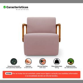 O encosto fixo é tapeçado com espuma D-23 e percintas elásticas, enquanto o assento oferece espuma D-26, manta acrílica e percintas para um apoio macio e ergonômico. Revestida em Veludo, proporciona toque agradável e visual sofisticado. Os pés plásticos fixados com parafuso conferem estabilidade e segurança, e o produto é enviado montado, pronto para uso.