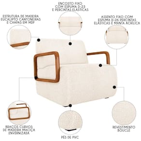 - Braços curvos de madeira maciça envernizada.