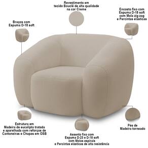 Características: Estrutura em madeira de lei (eucalipto), tratada e aparelhada com reforços de cantoneiras e chapas em OSB. Revestimento em tecido Bouclê de alta qualidade na cor Creme. Assento fixo com espuma D-23 e D-18 soft, molas espirais e percintas elásticas de alta resistência. Encosto fixo com espuma D-18 soft, mola zig zag e percintas elásticas. Braços com espuma D-18 soft. Pés de madeira torneado. Design orgânico para uso em diversos ambientes. Peso suportado: Até 120 kg por assento.