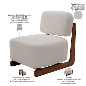 Características: Estrutura em madeira de reflorestamento de eucalipto vermelho tratado. Revestimento em tecido Bouclê de alta qualidade na cor Creme. Assento e encosto fixos tapeçados com espuma D-28 e percintas elásticas de alta resistência para maior sustentação. Pés em madeira maciça envernizada na cor Nozes, com design curvo. Peso suportado: Até 120 kg.