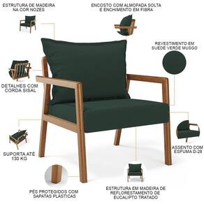 A Poltrona Decorativa Para Sala de Estar e Living Alícia B04 Suede Verde Musgo é a peça perfeita para adicionar um toque de estilo moderno a sua sala de estar. Com sua estrutura em madeira maciça envernizada, essa poltrona de madeira traz durabilidade e elegância para o ambiente. O assento estofado e revestido com materiais de qualidade oferece conforto excepcional, permitindo que você relaxe com estilo. Já o design moderno combina perfeitamente com qualquer tipo de decoração, tornando-a uma escolha versátil para qualquer sala de estar, living, recepção, escritório e diversos outros ambientes. A cereja do bolo fica por conta do detalhe da corda trançada no encosto com a almofada sobreposta, um charme à parte.